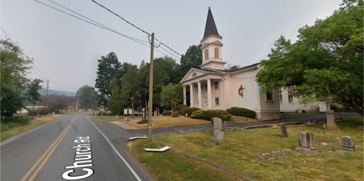 Church Offices, Additional Church Parking, and Education Building on the left of Church Road